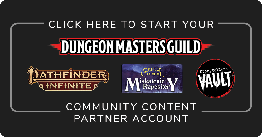 Du möchtest Inhalte für Dungeon Masters Guild, Pathfinder Infinite, Miskatonic Repository und mehr erstellen? Wähle diese Option, wenn du einen Titel für einen Gemeinschaftsinhalt erstellst. Du brauchst KEIN Publishing Partner-Konto und kannst direkt über dein eigenes Kundenkonto veröffentlichen.
